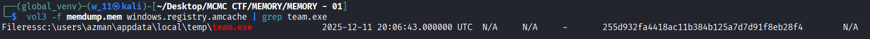 C:\Users\<User>\AppData\Local\Tempbecause standard users have write permissions there. We suspect a tool named mk.exe (common for Mimikatz). - We use windows.filescan to confirm file presence and windows.amcache to retrieve metadata. Even if the file is deleted from disk, the Amcache hive stores execution history, including the SHA1 hash.