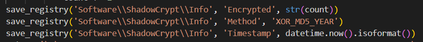 - Unique encryption keys for each file are generated and written to HKCU\Software\ShadowCrypt\Keys.