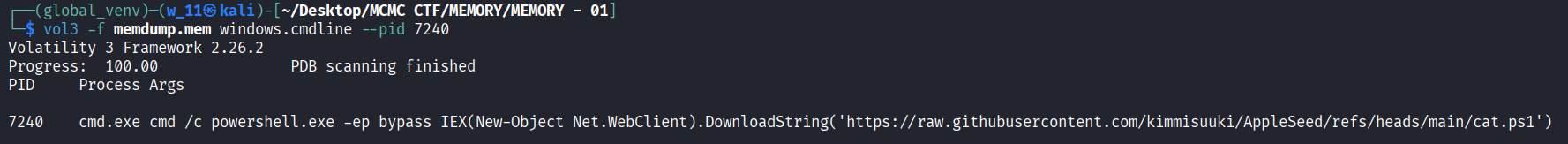 - We can found the github repository with the check of what does the powershell.exe run. In the terminal bellow we can see that it downloads cat.ps1 from a repo of AppleSeed which created by kimmisuuki.