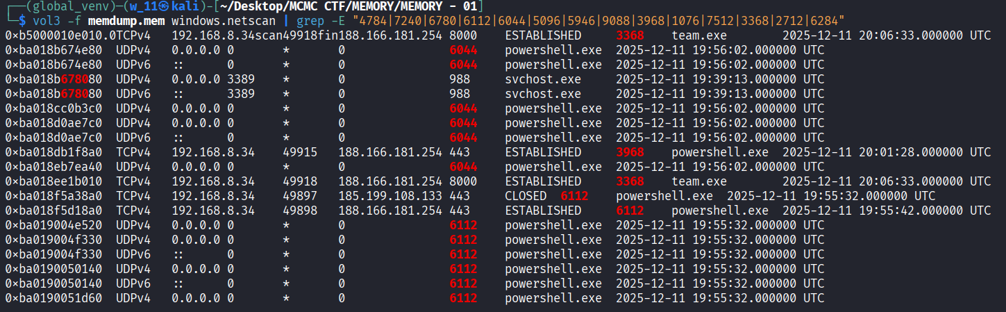 - Volatility 3 Plugins: pslist, cmdline, netscan, filescan, amcache, registry.printkey, pstree